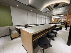 店内には3台のタッチパネルでオーダーできるセルフオーダーキオスクをはじめ、2台同時に注文を伺えるドライブスルーシステムも導入されております。